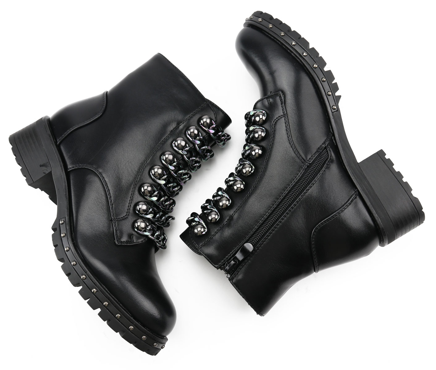 Chained Biker Boots - deze zwarte biker boots hebben een stijlvol uiterlijk, door de 'veters' van donkergrijze kettingen aan de voorzijde. In het voorste gedeelte van de zool zijn ook donkergrijze studs verwerkt. Dit geeft de laarsjes een stijlvolle en stoere uitstraling!